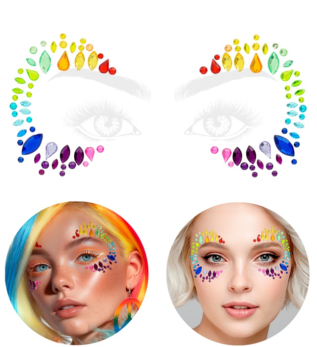 Deimantai išdėstyti stilingais rateliais aplink akis, todėl padeda sukurti įspūdingą, simetrišką makiažo efektą be didelių pastangų. Vaivorykštės spalvos gražiai atsispindi šviesoje ir traukia dėmesį, puikiai papildydamos festivalių, vakarėlių ar pasirodymų įvaizdį.