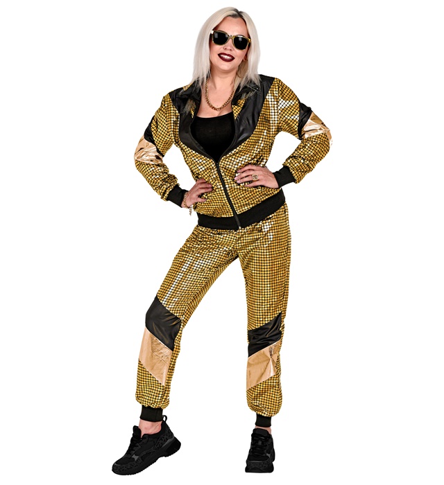 Įženk į šokių aikštelę su tikru 70–80-ųjų diskotekos spindesiu! Šis blizgus auksinis sportinis disco kostiumas – puikus pasirinkimas karnavalui, teminiam vakarėliui, Helovynui ar retro diskotekai.