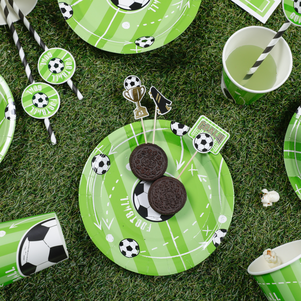 Vienkartinės lėkštutės „Futbolas“ – puikus pasirinkimas futbolo tematikos šventėms ir vakarėliams! Lėkštutės ryškiai žalios spalvos, dekoruotos futbolo kamuolių motyvais, kurie sukurs gyvą ir žaismingą atmosferą bet kokiai šventei. Pagamintos iš kokybiškos medžiagos, jos yra patvarios ir patogios naudoti. Idealiai tinka serviruoti užkandžius, saldumynus ar kitus patiekalus. Vienkartinės lėkštutės „Futbolas“ – praktiškas ir stilingas sprendimas, kuris papuoš jūsų futbolo tematikos gimtadienį ar vakarėlį!