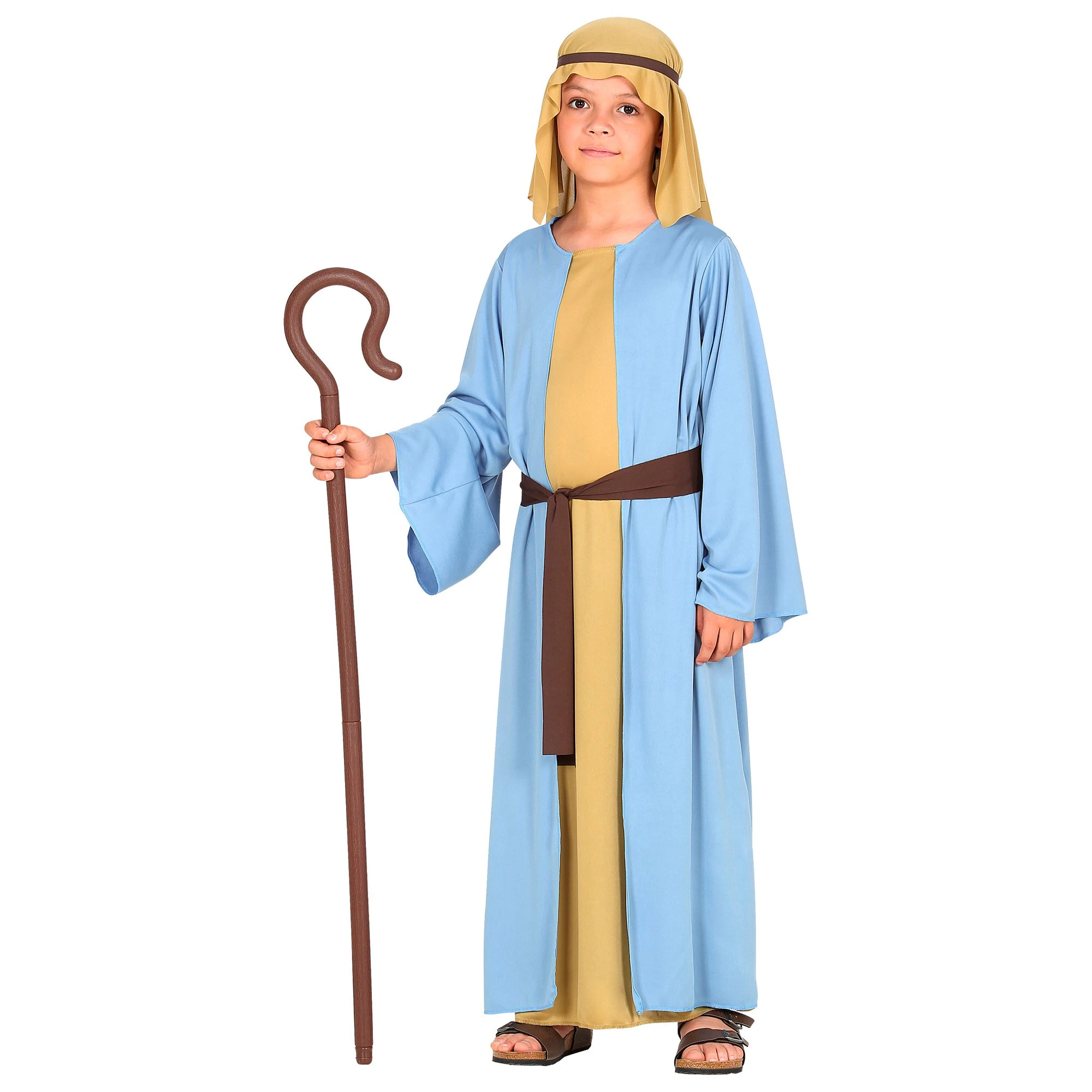 Žydras piemenėlio kostiumas su kreminės spalvos tunika, galvos apdangalu ir rudu diržu bus nepamainomas kuriant Kalėdinių švenčių, spektalių, pasirodymų ir religinės tematikos įvaizdžius.
