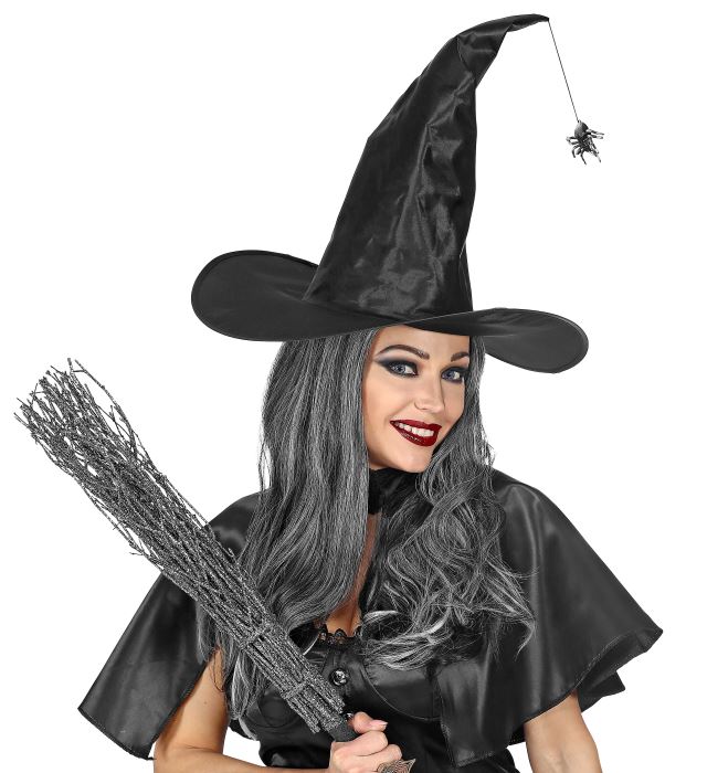 Klasikinis raganos skrybėlės dizainas su kabančiu voru.