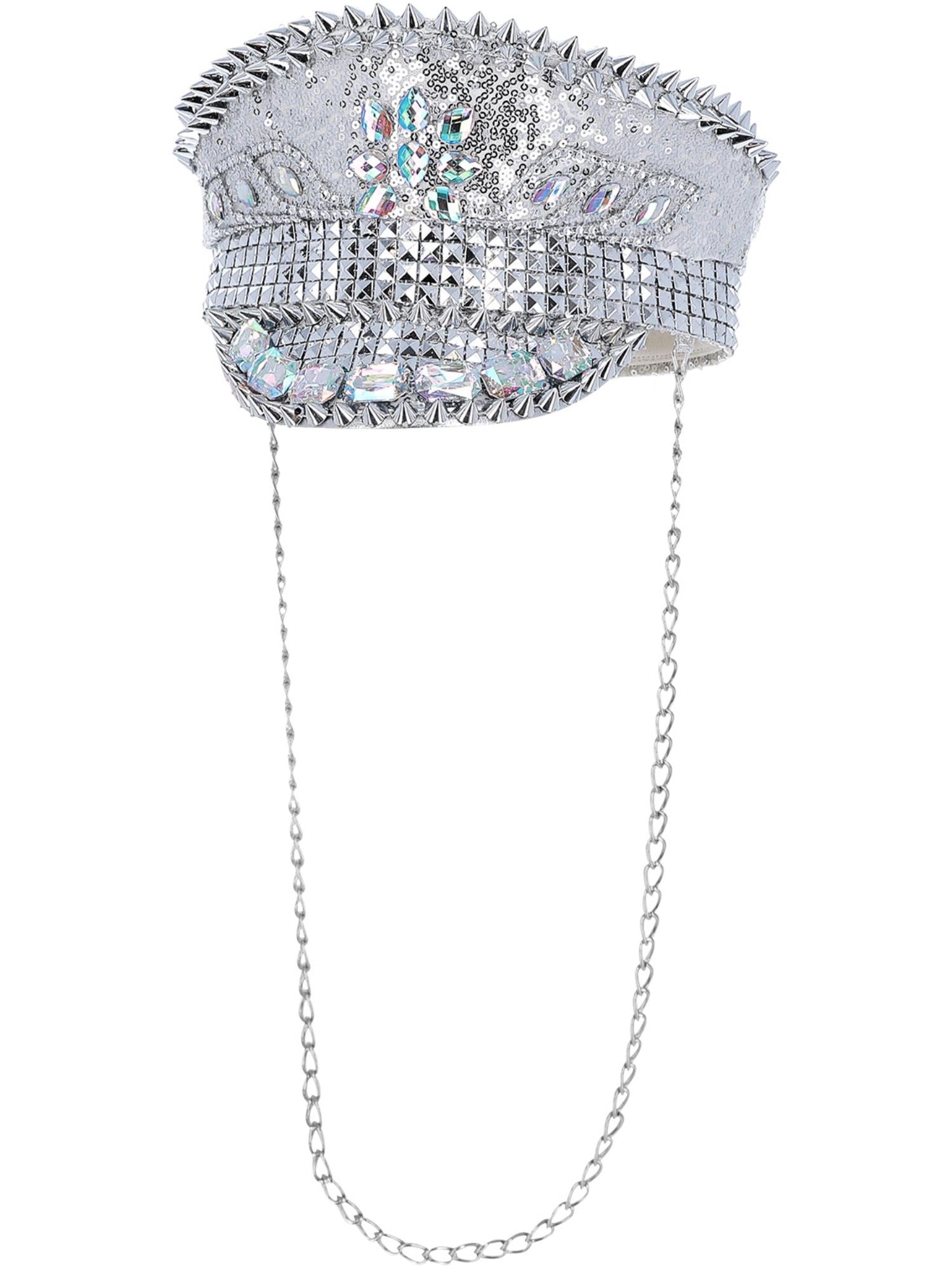 Papildykite savo įvaizdį prabangiu ir akį traukiančiu aksesuaru su šia sidabrine kapitono stiliaus skrybėle! Ji dekoruota blizgiais žvyneliais, šviesą atspindinčiais elementais ir sidabrine grandinėle, todėl gražiai spindi apšvietime ir suteikia išskirtinį, sceninį efektą.