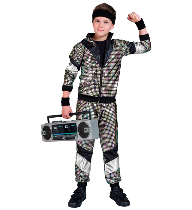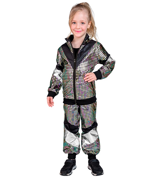 Sportinis disco kostiumas vaikams – spindintis ir energingas pasirinkimas mažiesiems vakarėlių žvaigždėms! Sidabrinės, veidrodinio efekto medžiagos kostiumas akimirksniu patraukia dėmesį ir sukuria tikrą disko šokių aikštelės nuotaiką.