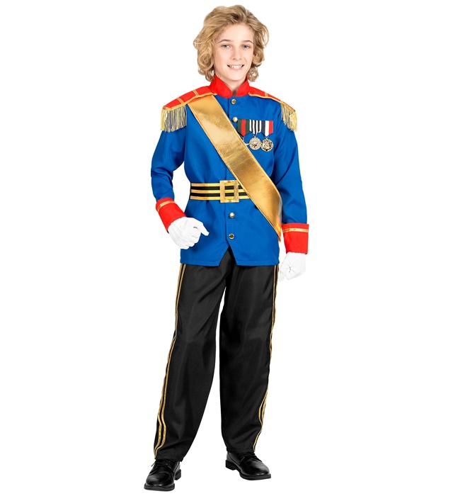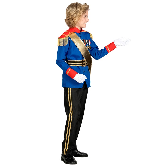 Kostiumą sudaro klasikinės juodos kelnės ir puošnus mėlynas švarkas, dekoruotas auksiniais bei raudonais akcentais, suteikiančiais karališko prabangumo įspūdį. Ryškios detalės ir dailus kirpimas kuria išskirtinį princo įvaizdį, kuris tikrai patrauks dėmesį.